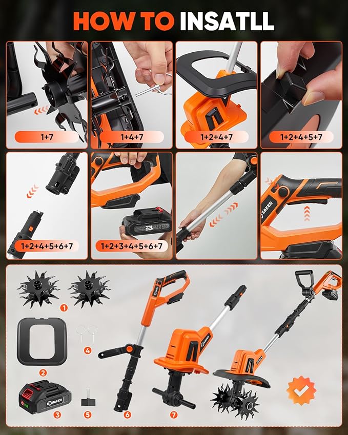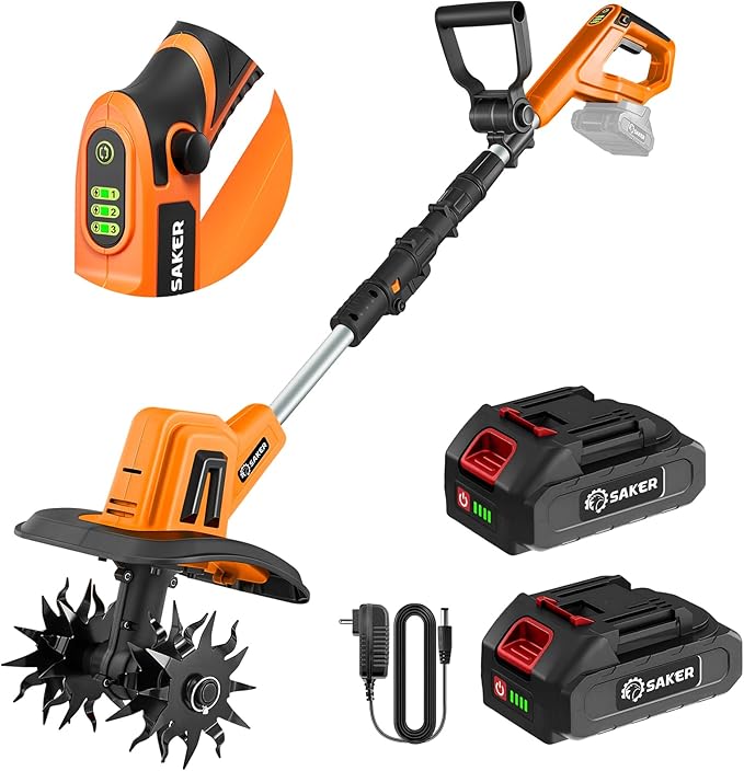 - 【Ergonomic Comfort】 Engineered for fatigue-free operation, the Saker cordless garden tiller includes an adjustable auxiliary handle and ergonomic grip, ensuring comfort for users of all ages.