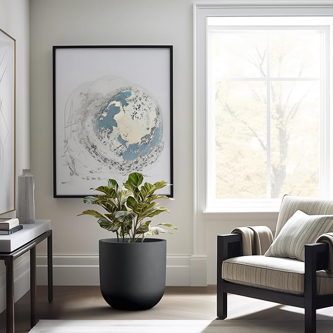Kante 16.5" Round Concrete Planter, Large Cylinder Plant Pot with Curved Bottom and Drainage Hole, for Indoor and Outdoor Use – Garden or Patio, Black Finish with Warm Brown Interior