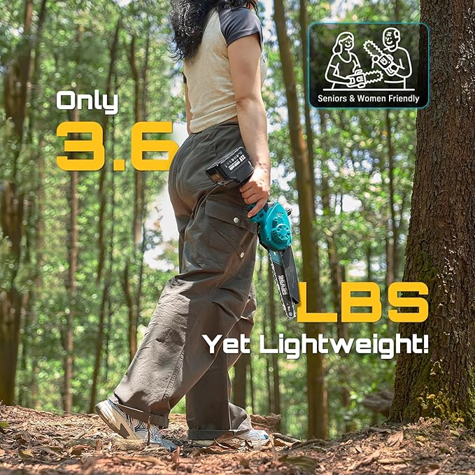 - ✅【Lightweight & Ergonomic for Easy to Use】Weighing only 3.6 lbs, this lightweight portable chainsaw is easy to handle for women, seniors, and anyone trimming overhead branches or working in tight spaces. Ideal for precision pruning, limb removal, and portable cutting