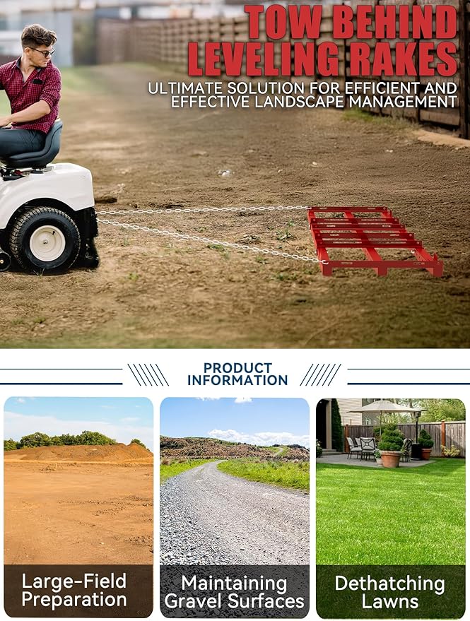 - Dual-Side Functionality & Flexible Use: Flip the drag harrow to switch functions: use the tine side for aggressive soil breaking, dethatching, and manure spreading, or flip to the smooth side for fine grading, top-dressing, and creating a perfectly smooth finish on driveways and riding arenas.