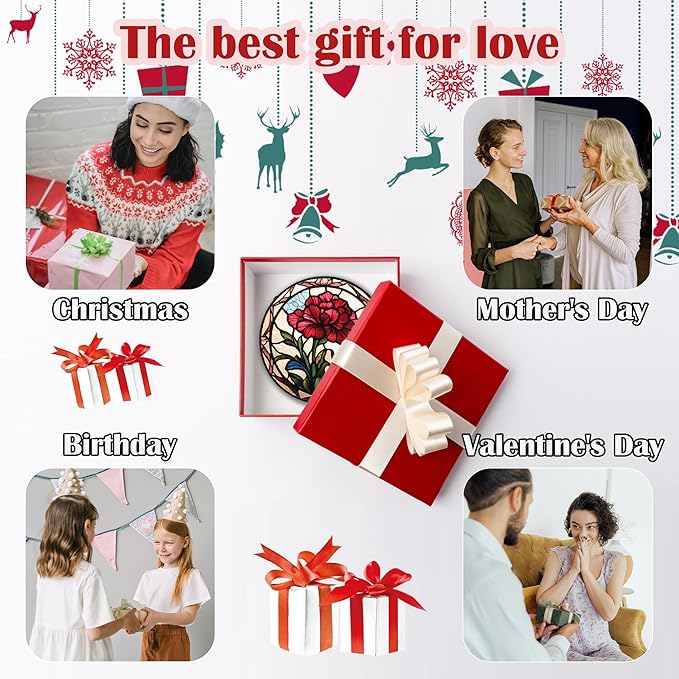 Stained Glass Window Hanging - Red Carnation Birth Flower Sun Catcher for Door Garden Home Decor Suncatcher Christmas Mother's Day Birthday Gifts for Women Men Mom Nana Friend Wife 9.8 in