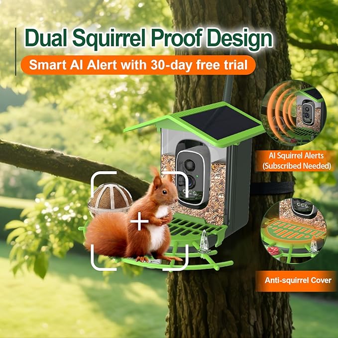 - Special Feature : AI identifies bird species, Dual Squirrel-Proof, Bird Arrival Alerts, Stable Wi-Fi Signal , Long Lasting, Weatherproof, Built-In Camera AI identifies bird species, Dual Squirrel-Proof, Bird Arrival Alerts, Stable Wi-Fi Signal , Long Lasting, Weatherproof, Built-In Ca… See more