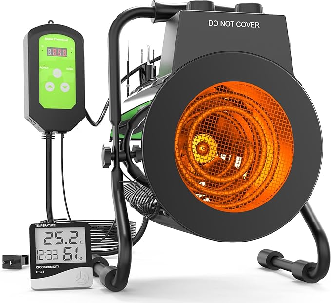 - Greenhouse Heater with Digital Thermostat: Equipped with a user-friendly digital thermostat, this electric heater allows you to select temperatures in either °F or °C. The adjustable heating range spans from 40°F to 108°F (5°C to 42°C), automatically turning off when the ambient temperature exceeds your set point by 1°C.
