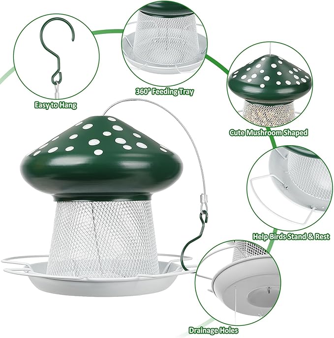 Bird Feeder, Heavy Duty Metal Bird Feeders for Outdoor Hanging, Cute Mushroom Shape Wild Birdfeeder for Outside Garden Yard (Green)