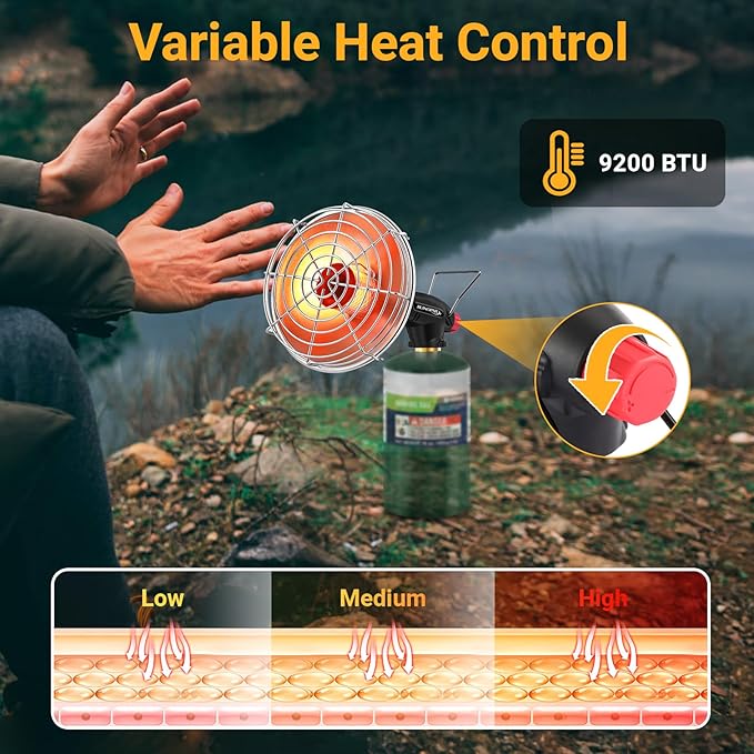 - 【POWERFUL HEAT OUTPUT & QUICK WARM-UP】Our high-performance propane outdoor heater delivers up to 9200 BTU. Adjustable heat settings let you customize warmth—from gentle heat to powerful output—so you stay comfortable in any environment.