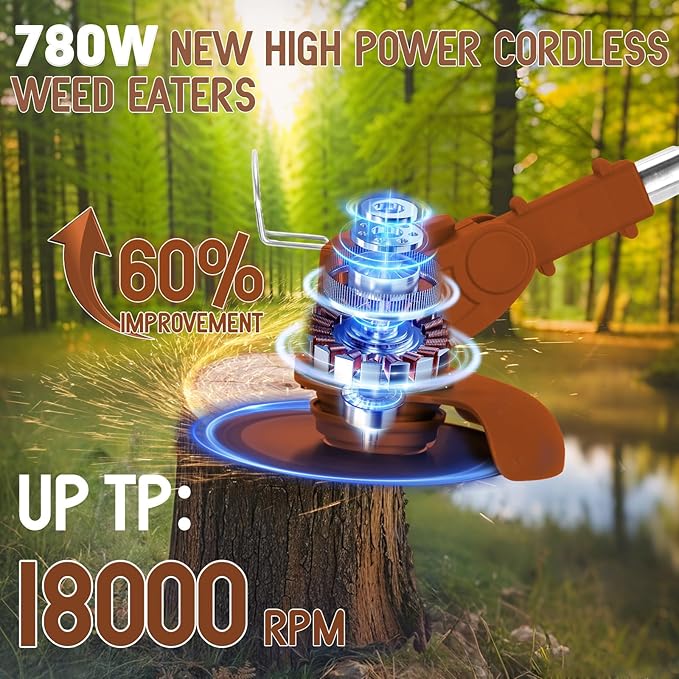 - [Powerful Performance]With an 18,000 RPM motor and 305mm cutting width, this electric weed wacker cordless slices through thick grass and weeds like a pro. Outperforms gas trimmers—quiet, eco-friendly, and zero maintenance!