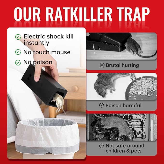 - 【Safe, Reusable & Easy Cleanup】 Unlike poisons or snap traps, this electric mouse trap zapper contains the process entirely within its chamber, keeping children and pets safe. It's fully reusable—just empty and reset. The electronic rat traps design ensures a clean and hygienic experience every time.