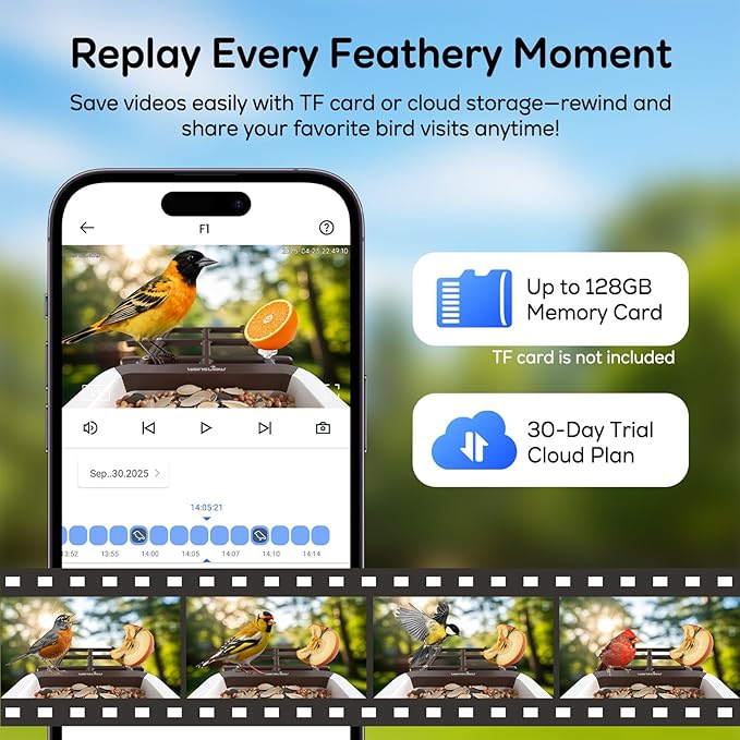 - Sun-powered, always watching. Save moments with TF card or cloud: Our bird feeder features a high-efficiency solar panel that powers the bird feeder camera for non-stop operation. This camera bird feeder supports TF card storage (up to 128GB, not included) and 30-day trial of a subscription plan, offering flexible ways to save and revisit all your favorite feathery moments. Ideal for continuous use, this bird feeder with camera solar powered lets you enjoy birds day and night, rain or shine!
