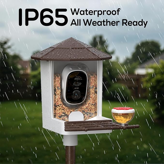 - Weatherproof bird feeder defends day and night: Engineered with advanced sealing technology and a fully IP65 waterproof construction, this feeder offers thorough defense against rain, snow, and humidity, ensuring birdseed remains fresh and completely dry through varying seasons. Enjoy uninterrupted viewing with durable, all-weather protection for your feathered friends.