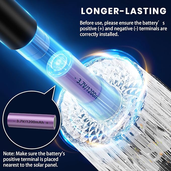 - 【Precautions】Before use, please ensure the battery’s positive (+) and negative (-) terminals are correctly installed. The battery is marked with polarity symbols—please make sure the positive (+) terminal is aligned with the corresponding positive (+) position on the solar light (i.e., the side closest to the solar panel).