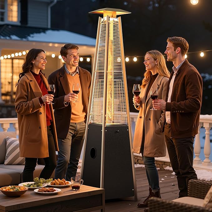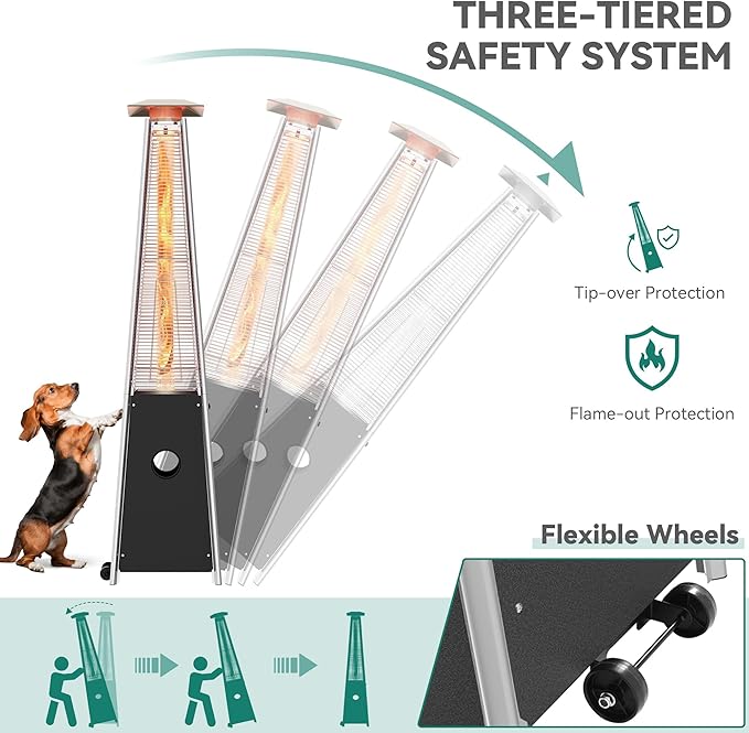 - Safe & Reliable Design: This outdoor pyramid heater prioritizes your safety, featuring a tilt sensor, flame-out protection, and an auto shut-off valve to ensure safe use every time; Its stainless steel frame and tempered glass tube offer lasting durability