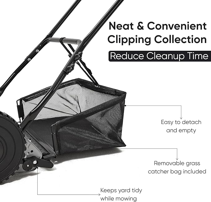 16" Push Reel Lawn Mower with Grass Catcher – Manual 5-Blade Hand Mower, Adjustable 3-Position Cutting Height (0.5"–1.75"), Lightweight & Eco-Friendly – 1-Year Warranty
