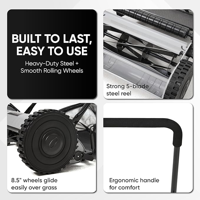 - Durable steel reel and sturdy wheels – Built with a long-lasting 5-blade reel and two 8.5" wheels for smooth rolling and balanced mowing.