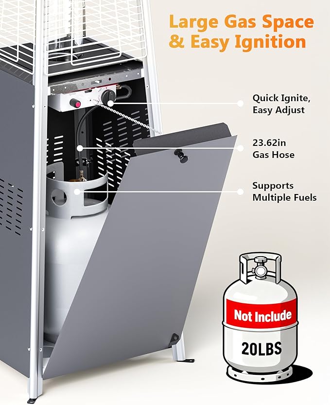 - 【Powerful & Long-Lasting Heat】Our propane heater delivers up to 48,000 BTU of heat, warming a 10-foot radius to keep everyone comfortable even on cold evenings. Designed for convenience, this patio heater works with a standard 20 lb propane tank (not included) and runs 8–10 hours on a full tank. The magnetic side door allows for quick and easy tank replacement, making it one of the most user-friendly patio heaters for outdoor use