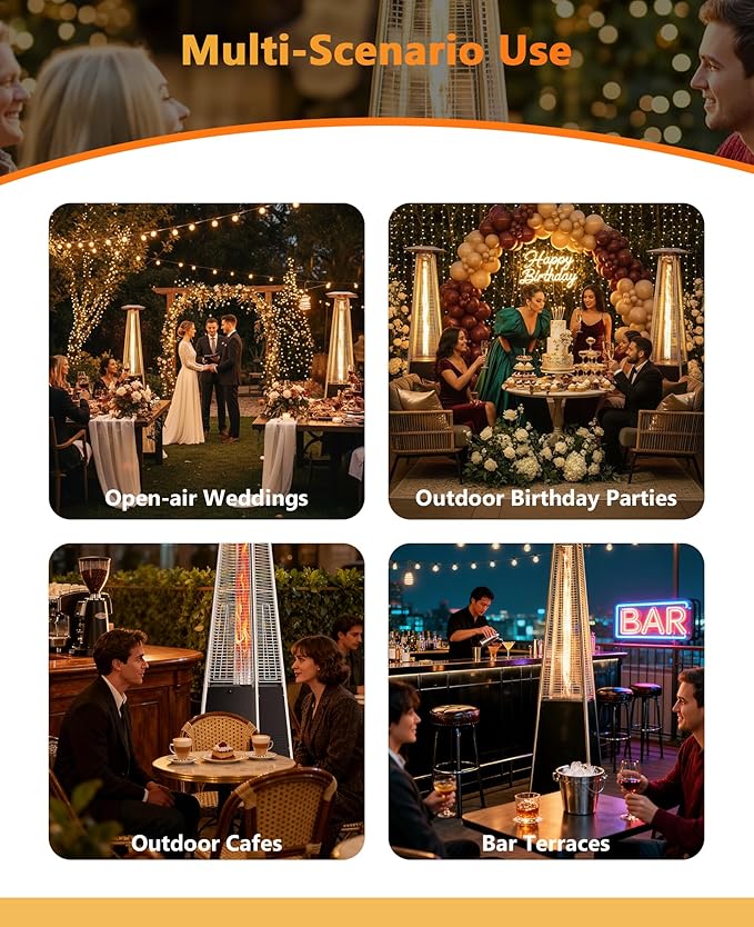 - 【Create a Cozy Atmosphere】More than just a heater, this pyramid-style outdoor heater for patio provides a warm and inviting atmosphere. The dancing flame inside the glass tube delivers elegance and comfort, making it ideal for family gatherings, backyard parties, restaurants, or cafes. These patio heaters for outdoor use guarantee a memorable experience on cool nights