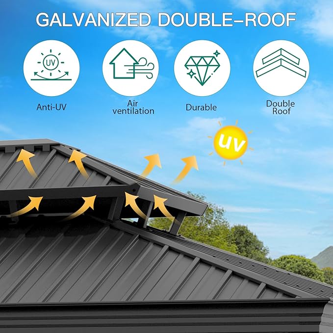 - The weather-resistant tin roof and aluminum Frame - Treated with a protective waterproof coating, works seamlessly with the included privacy curtains and insect netting. This combination ensures a consistently dry, breezy, and comfortable environment inside your gazebo year-round